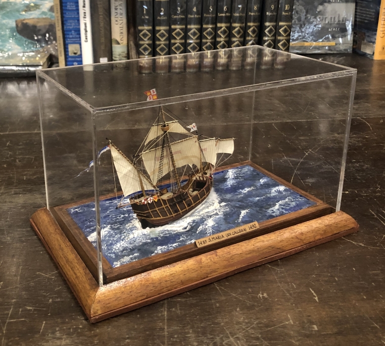 Modello in plastica della caracca Santa Maria (ex Gallega, 1489-1492) ambientato in un diorama marino, con base in legno e teca in plexiglass.