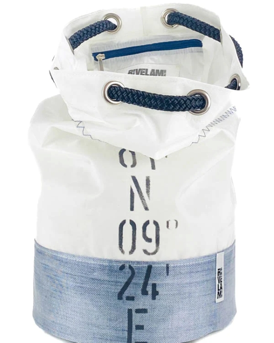 Tutti i prodotti “Rivelami” sono realizzati con vele riciclate al 100%. Ogni creazione è un pezzo unico, numerato e accompagnato da un certificato di autenticità che riporta l’origine della vela e i dettagli degli elementi decorativi. Lavabile a mano o in lavatrice max 30°C. Non usare asciugatrice.