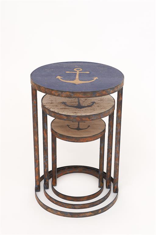 Set di tre tavolini in stile industriale. Ogni tavolino è realizzato in metallo ossidato e legno dipinto in stile shabby chic. I tavolini possono essere adoperati separatamente e comodamente impilati l’uno dentro l’altro per salvare spazio.