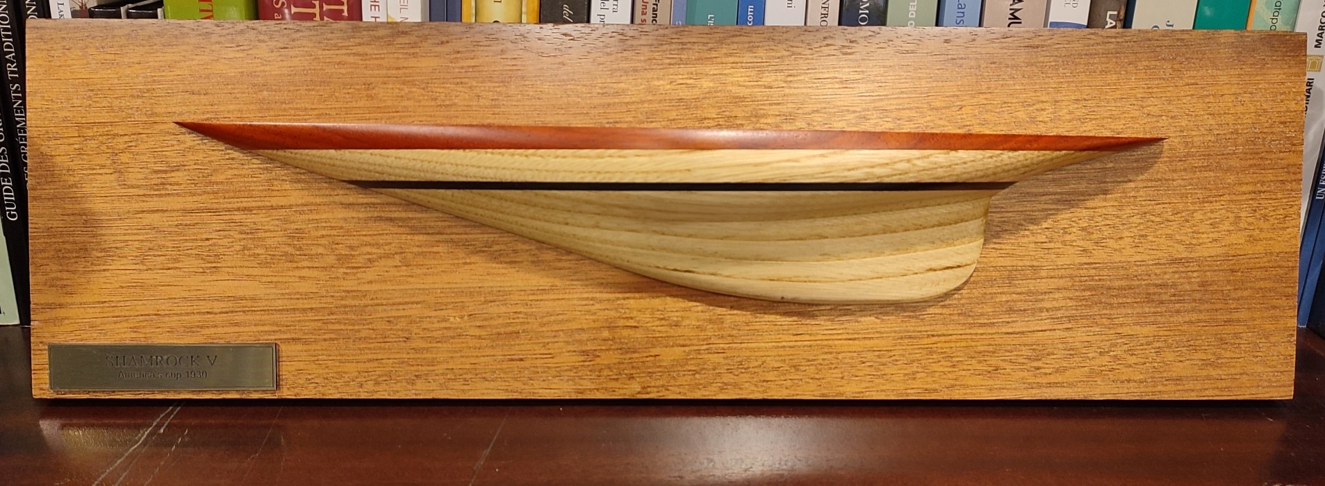 Mezzo scafo in legno che riproduce la barca a vela Shamrock V nel 1930, anno in cui partecipò alla Coppa America.