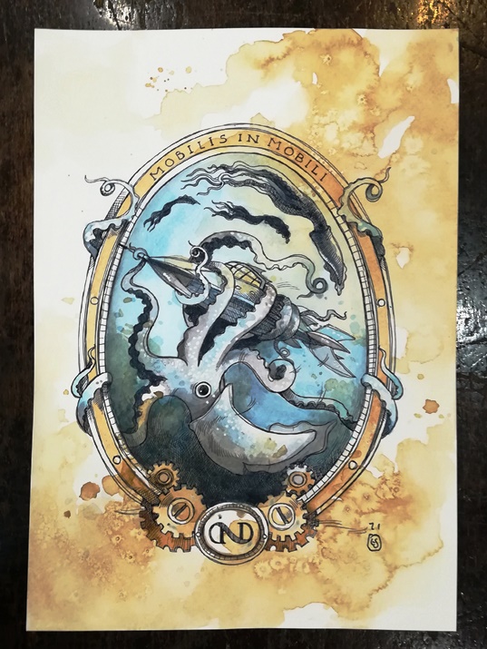 Stampa su cartoncino tinto a macchie di caffè e acquarellata a mano ispirata al romanzo Ventimila leghe sotto i mari di Jules Verne.