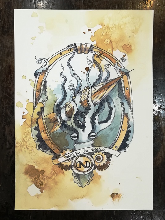 Stampa su cartoncino tinto a macchie di caffè e acquarellata a mano ispirata al romanzo Ventimila leghe sotto i mari di Jules Verne.