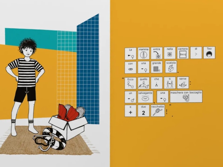 Il testo è scritto interamente con il modello inbook, che utilizza i simboli della Comunicazione Aumentativa Alternativa (CAA) per rendere la lettura accessibile anche a chi ha difficoltà comunicative. È uno strumento inclusivo che può essere usato con successo da tutti e tutte, a scuola e a casa, per leggere, osservare e parlare insieme.