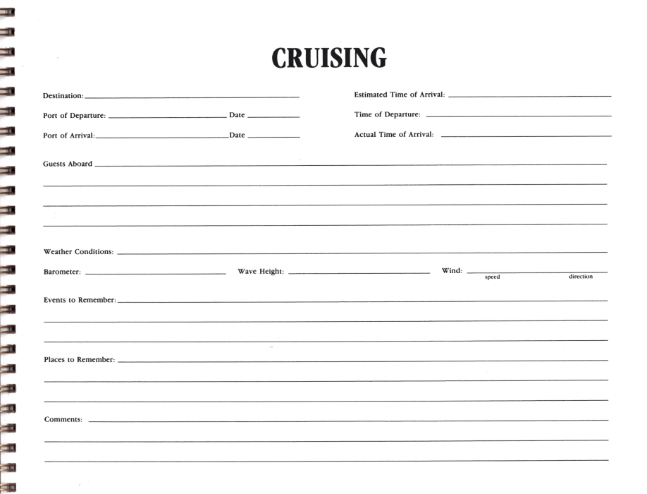 Il Cruising Log offre ampio spazio per registrare informazioni sulle vostre escursioni nautiche. Contiene, inoltre, un registro degli ospiti e pagine di consultazione rapida che forniscono informazioni su argomenti quali: regole della strada, procedure radio, segnali di soccorso e riferimenti meteorologici.