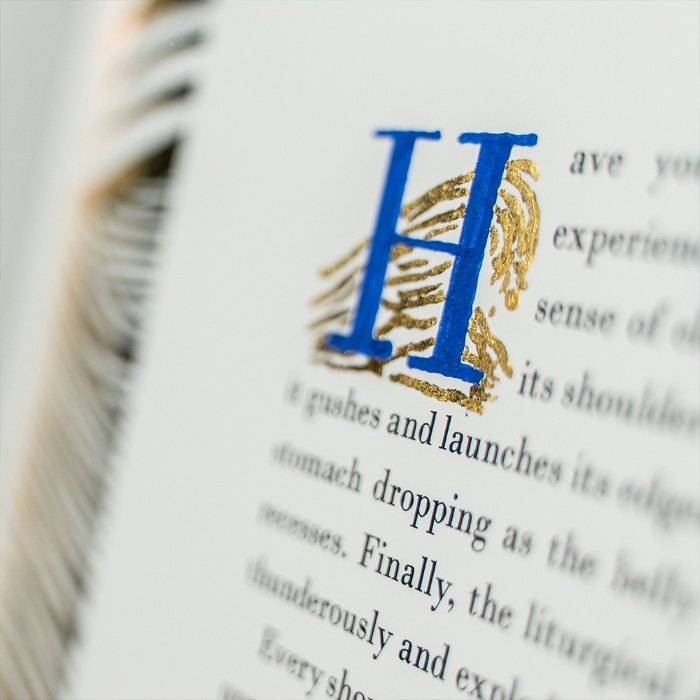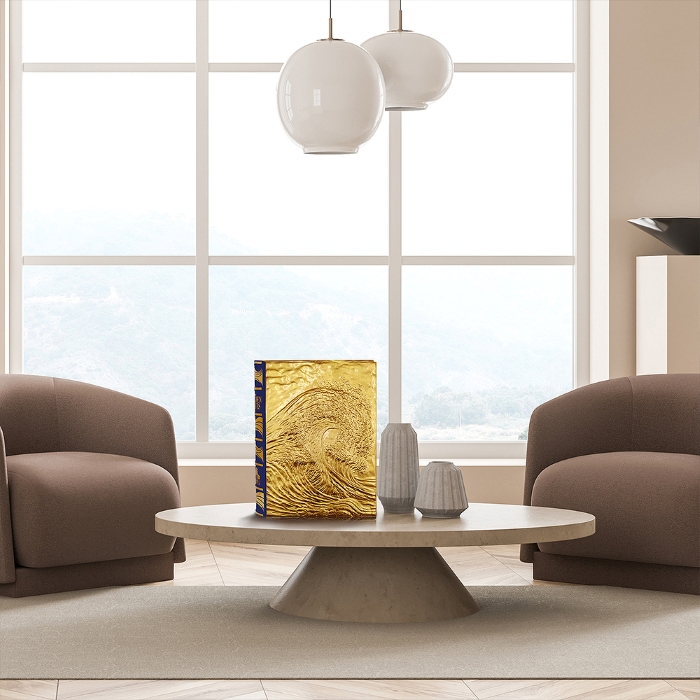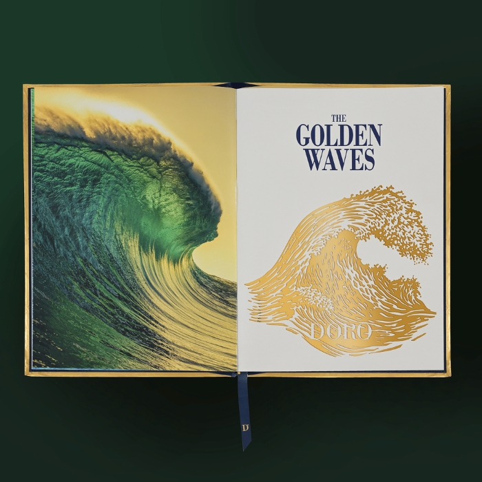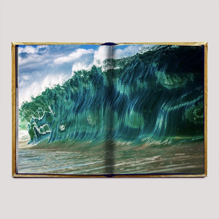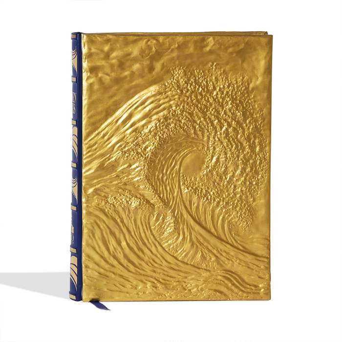 Ogni copertina di The Golden Waves nasce come una scultura originale in rame e oro 24 carati: un’opera d’arte tridimensionale, dove la materia racconta il movimento dell’acqua, fissandolo nel tempo. La legatura è in pelle blu.