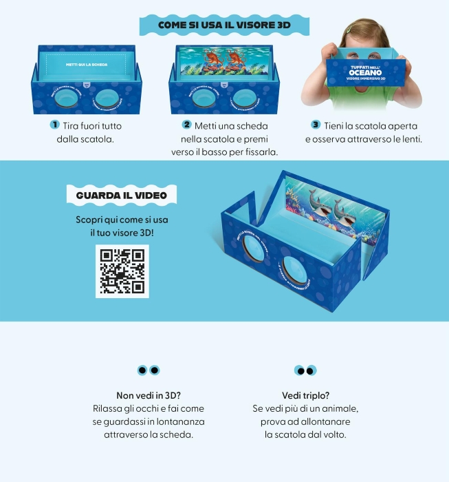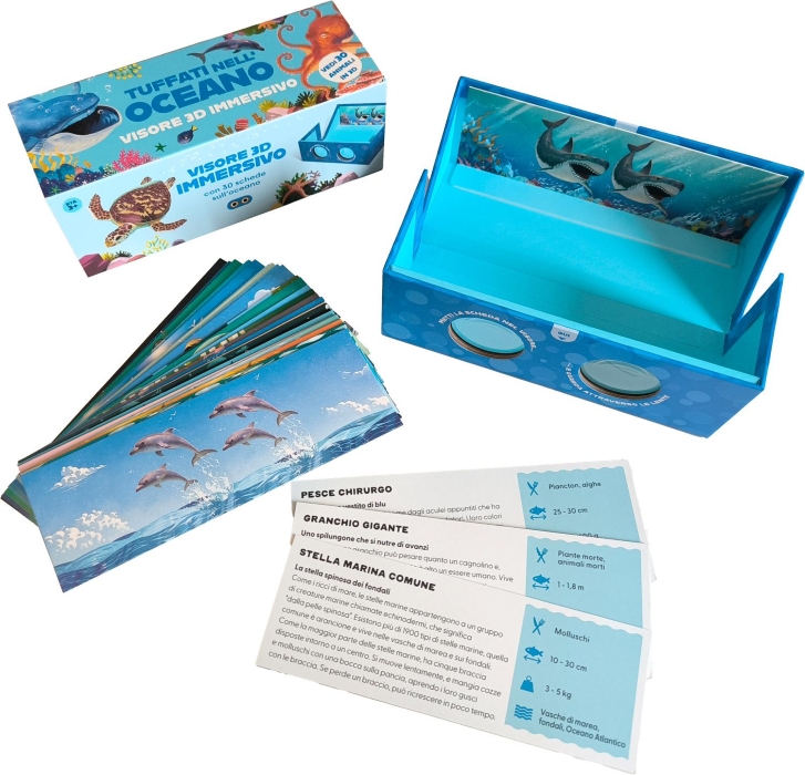 Scegli una scheda di un animale marino, inseriscila nella scatola, poi guarda attraverso le lenti e… preparati a tuffarti nelle profondità dell’oceano! Vedrai il grande squalo bianco andare a caccia, la balenottera azzurra nuotare maestosa e l’abilissimo polpo mimetizzarsi tra i coralli.