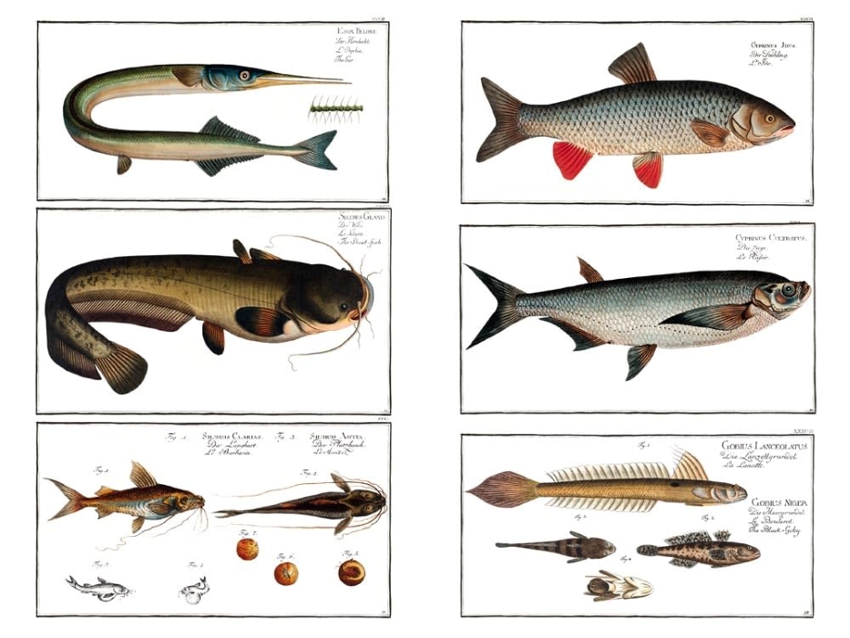Un libro prezioso fatto del silenzio delle profondità. 416 specie di pesci divinamente illustrate dal più grande ittiologo del mondo. Bloch lavorò per tredici anni alla sua opera in dodici volumi volta a raccogliere tutte le varietà di pesci esistenti e in questo libro ne troviamo una parte considerevole.