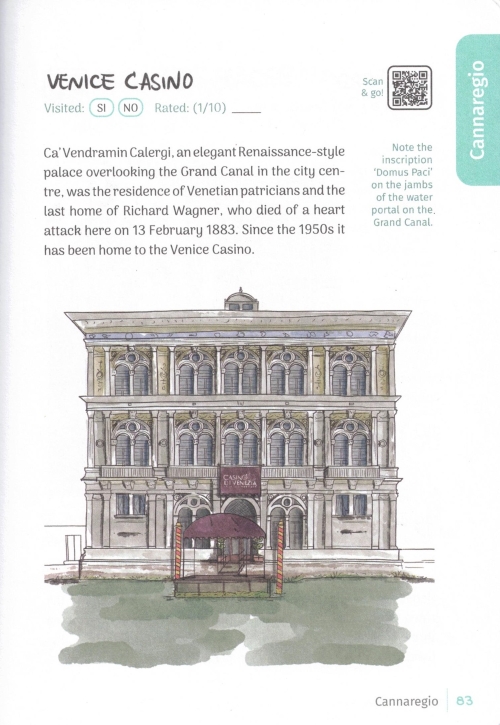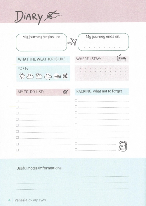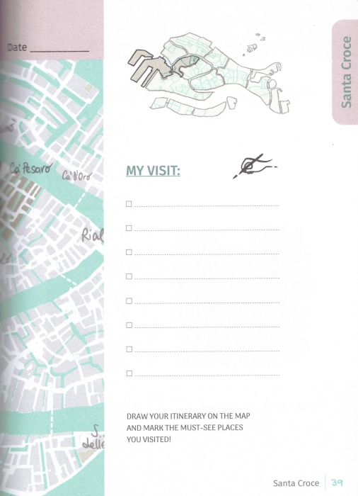 An illustration guide to the must-see places in Venice, from the best-known to the secret ones, and at the same time a travel notebook, through pages of guided journals where you can collect your notes and create your very own personal logbook, keeping track of the places and preserving the memory of the most exciting recollections, so as to make this book a unique and personal piece.