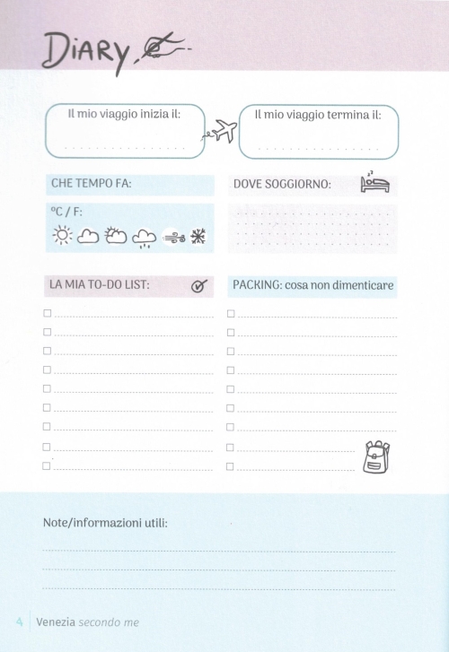 La guida illustrata ai luoghi da non perdere di Venezia, dai più conosciuti a quelli segreti, ed allo stesso tempo un quaderno di viaggio. Attraverso pagine di journal guidate si potranno raccogliere appunti e creare il proprio personalissimo diario di bordo, tenendo traccia dei luoghi e conservando la memoria dei ricordi più emozionanti, così da rendere questo libro un pezzo unico e personale.